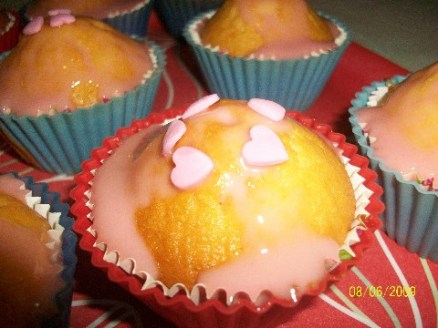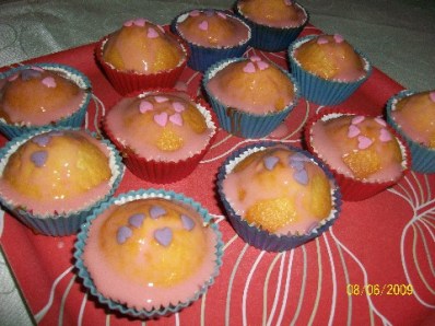 Un karışımını, sadece 1 adet yumurta ve yarım çay bardağı sıvı yağ ile el çırpıcısı yardımıyla 1-2 dakikada hazırlayabilirsiniz. Kağıt kalıplarda 25-35 dakikada fırında pişirdiğiniz muffinlerin üzerlerine de çilekli glazürü sadece 1-2 yemek kaşığı kaynamış suyla ezip yayabilirsiniz. Geriye ve en üstüne sadece minik kalp süsleme şekerleriyle şöleni tamamlamak kalıyor..