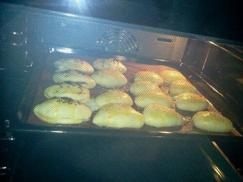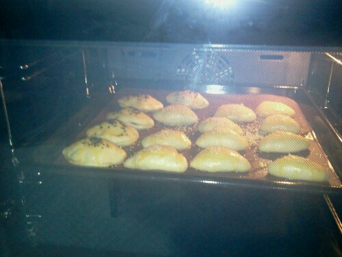 Onaltı tane pogaca çıkiyor. Yüzlerine yumurta sarisi, ustune susam, çörek otu.