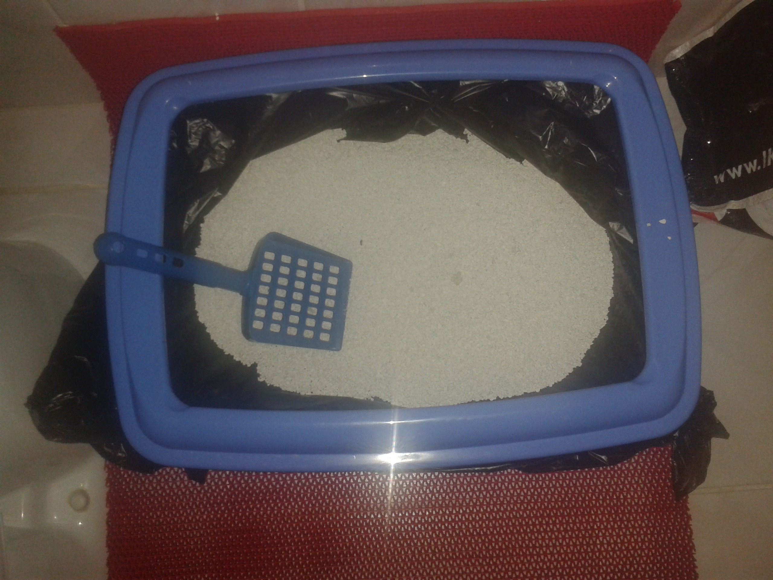 Eve kedi taşıma çantamız olmadığından bir piknik sepeti ile geldi. Tecrübeli kedi sahipleri ile olan görüşme ve yazışmalarımdan öğrendiğimi uyguladım. Önce tuvaletini hazırladım. Bir kat çöp poşeti üzerine kalın bir tabaka kum (gerçek kum değil. taşa daha çok benziyor aslında.. ) serdim.