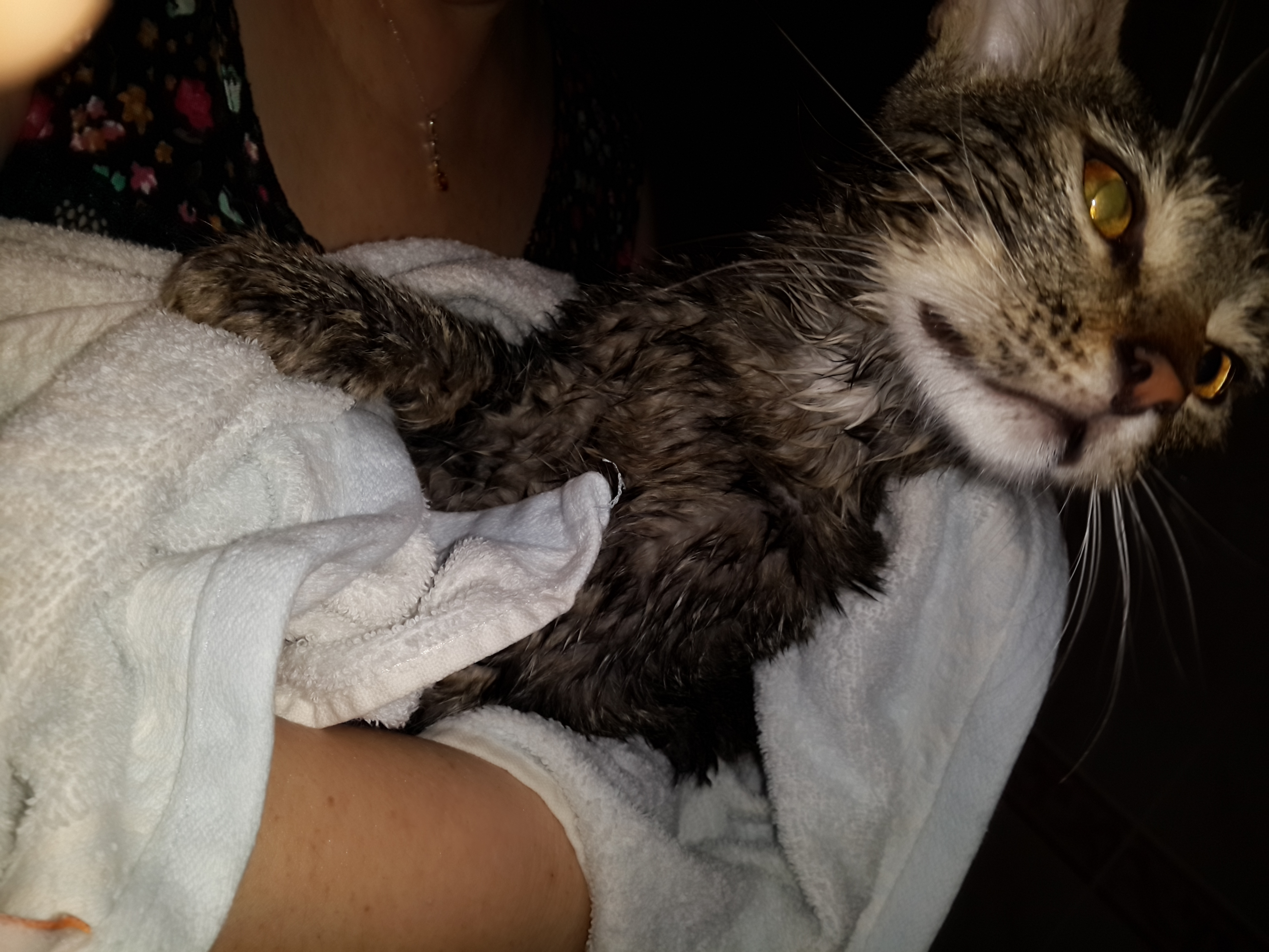 Veterinerde buluştuk eski sahibesi ile. Resimlerinde göründüğü kadar şirindi. Ve pek ürkekti. Sessiz sessiz duruyordu. Veteriner muayene etti, tırnaklarını kesti, iç parazit aşısını yaptı ve bize güzel bir kum kutusu hediye etti. Kumunu da oradan satın aldık zaten.